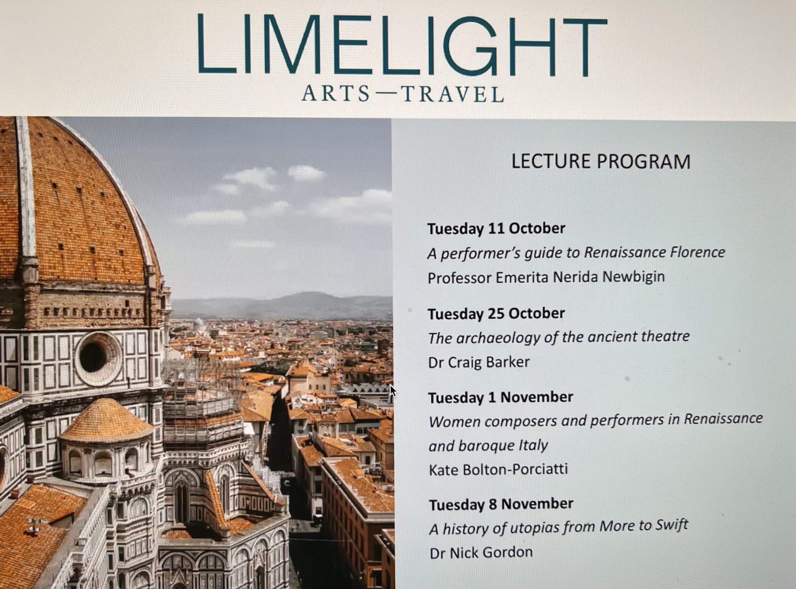 Whether it’s travel of the mind or travel of the being, you may wish to check out limelight-arts-travel for its newsletter, its upcoming lecture series or expert-led cultural trips.